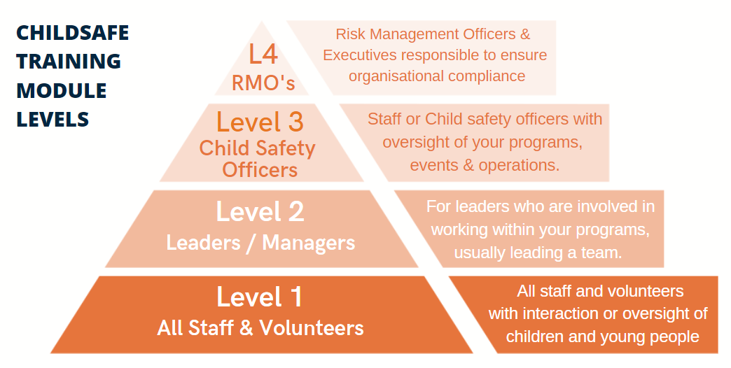 ChildSafe’s training supports the different levels of responsibility in your organisation. Each of the core standard modules builds on the one below it, according to level of responsibility, building safety capacity across the organisation. ChildSafe training engages your teams, embedding a common understanding of child-safe environments and equipping participants to fulfil their role in creating a safe organisation.